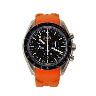 Omega Speedmaster HB-SIA GMT Numbered Edition Ref.321.92.44.52.01.003 circa 2010 self-winding automatic watch, features a 44.25mm titanium case surrounding a black dial on an orange rubber strap with a titanium deployment buckle. Functions include hours, minutes, small seconds, date, chronograph, GMT and tachymeter. This watch comes complete with box and papers.