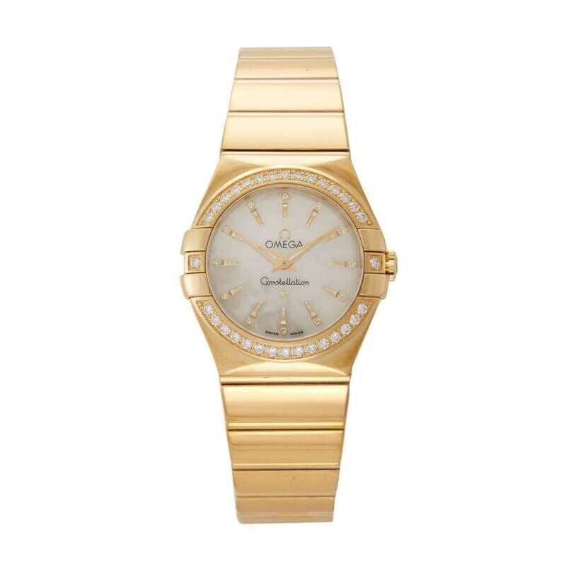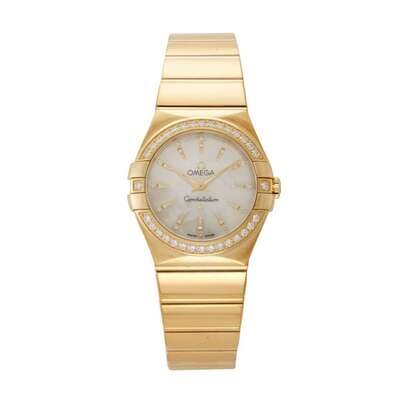 Omega Constellation Ref.123.55.27.60.55.008 circa 2010 quartz watch, features a 27mm 18k yellow gold case with diamond bezel surrounding a mother-of-pearl diamond dial on an 18k yellow gold bracelet with folding buckle. Functions include hours and minutes. This watch comes complete with box and papers.