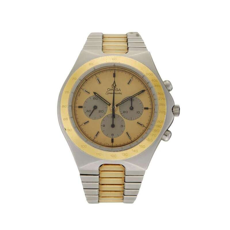 Omega Speedmaster Teutonic Ref.145.0040/3450803 (Made for the German Market) circa 1980 manual-wind caliber 861 watch, features a 43mm stainless steel and yellow gold case surrounding a champagne dial on a stainless steel and yellow gold bracelet with a stainless steel folding buckle. Functions include hours, minutes, seconds and chronograph. This watch does not come with box and papers.