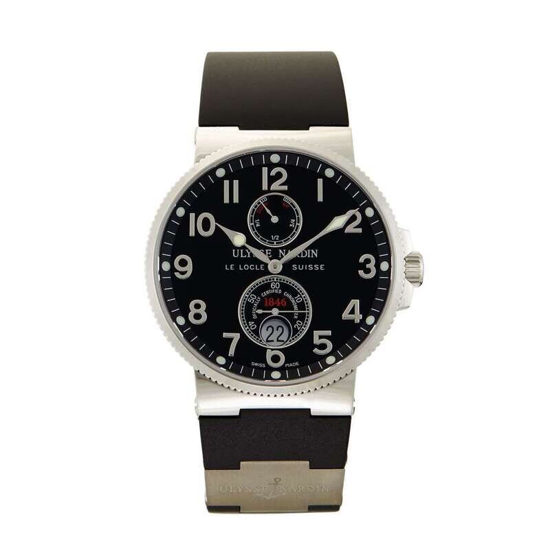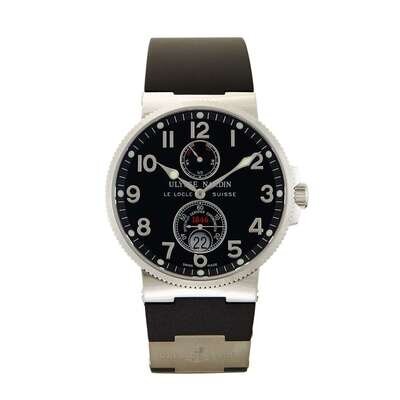 Ulysse Nardin Maxi Marine Chronometer Ref.263-66-3/62 circa 2010 self-winding automatic watch, features a 41mm stainless steel case surrounding a black dial on a brand new black rubber and stainless steel strap with a stainless steel deployment buckle. Functions include hours, minutes, small seconds, date and power reserve indicator. This watch comes complete with box and papers.