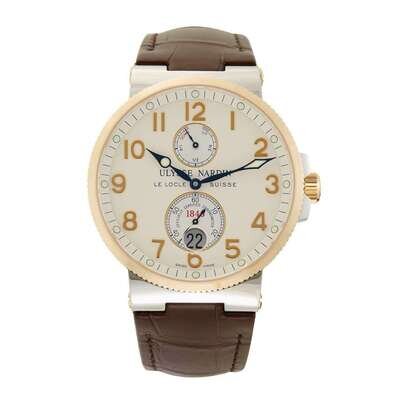 Ulysse Nardin Maxi Marine Chronometer Ref.265-66/60 circa 2010 self-winding automatic watch, features a 41mm stainless steel case with an 18k rose gold bezel surrounding a white dial on a brand new brown alligator strap with a stainless steel deployment buckle. Functions include hours, minutes, small seconds, date and power reserve indicator. This watch comes complete with box and papers.