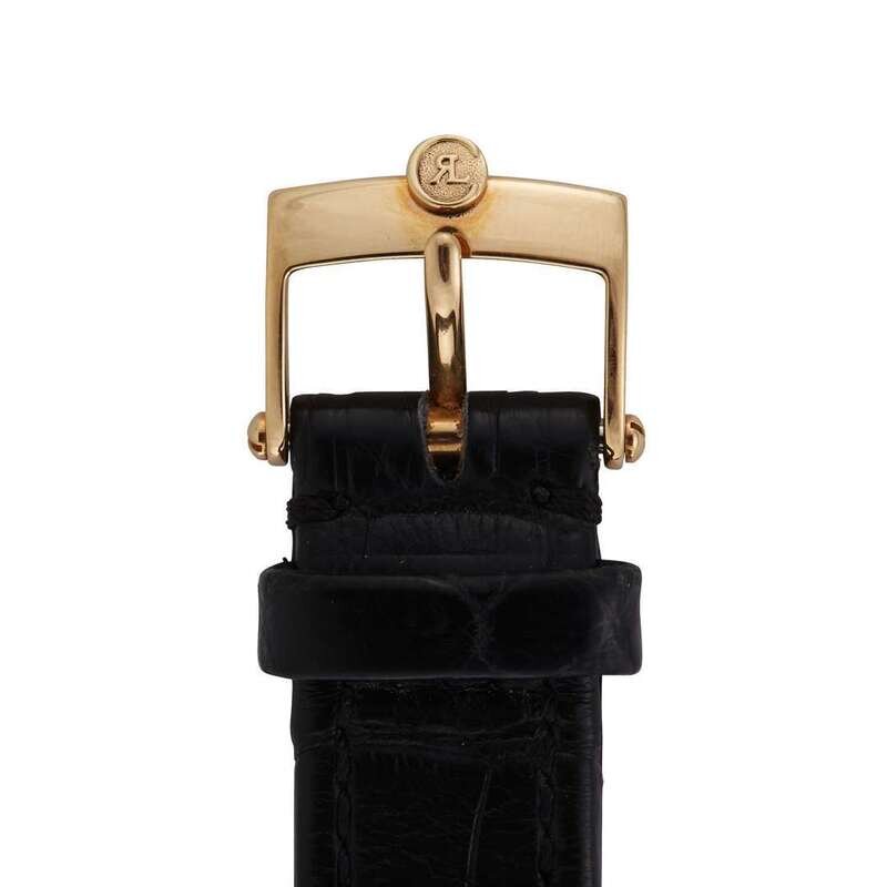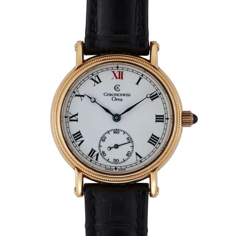 Chronoswiss Orea Ref. CH 1161 R 18k gold date watch with 17 jewel movement, case no. 02 002, sapphire set crown and mineral case back with original strap and 18k buckle.