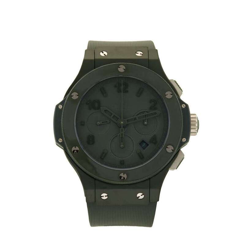 Hublot Big Bang Chronograph Limited Edition Ref.301.GI.5290 RG circa 2015 self-winding automatic watch, features a 44mm PVD coated ceramic case surrounding a green dial on a green rubber strap with PVD coated ceramic deployment buckle. Functions include hours, minutes, seconds, date and chronograph. This watch comes complete with box and papers. This is a limited edition of 500 pieces.