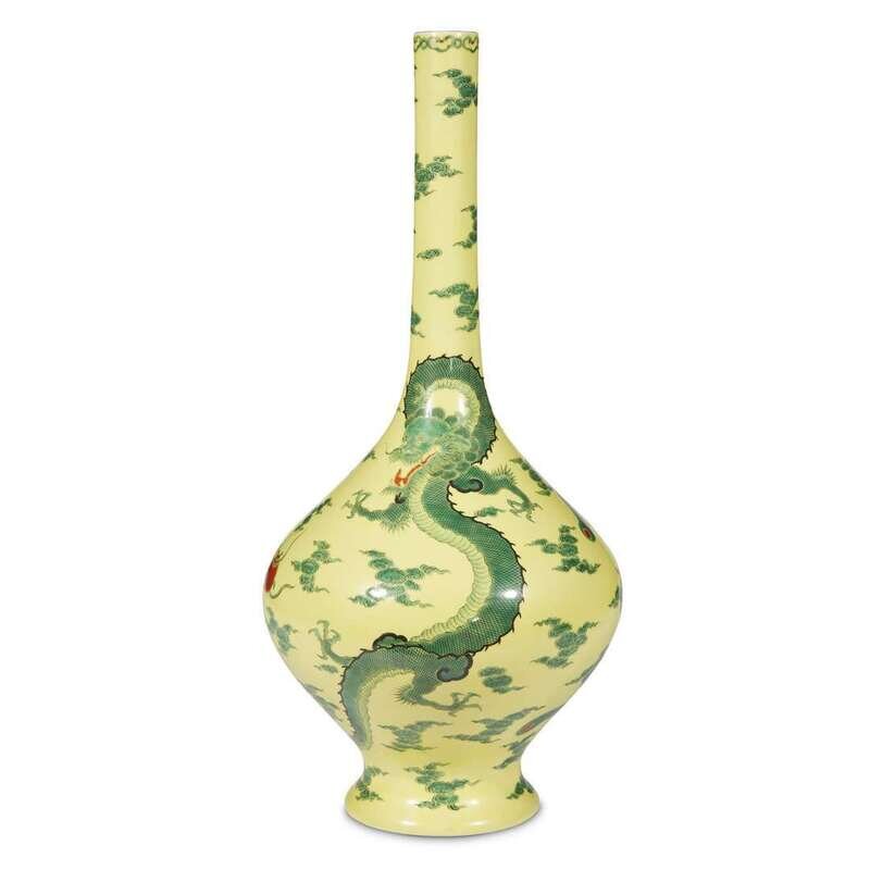 of pear shape, the compressed globular body rising from a short splayed foot to a tall cylindrical neck, decorated on the body in green, black and red with phoenix, dragon and ruyi clouds.