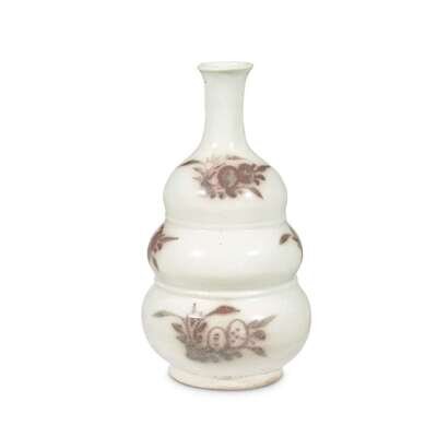the stepped body rising to a tall slender neck and lipped rim, decorated with sprays of fruit and foliage.