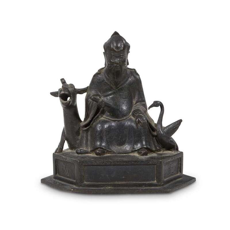 possibly the cover to a censer, cast in the form of Shoulao seated, holding a scroll in his left hand, accompanied by a recumbent deer and a crane.