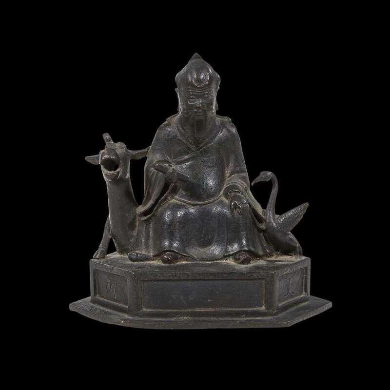 A Chinese bronze figure of a Daoist immortal the base inscribed yongzheng wu bing, corresponding to 1726