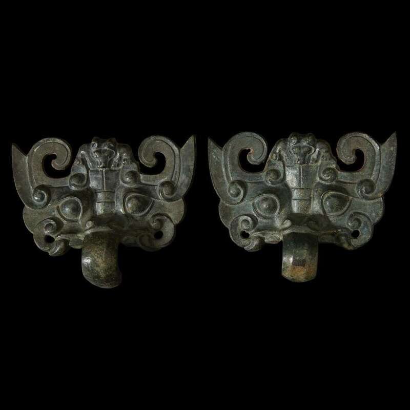 A pair of Chinese Han-style patinated bronze 'Taotie mask' door handles