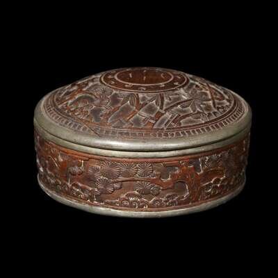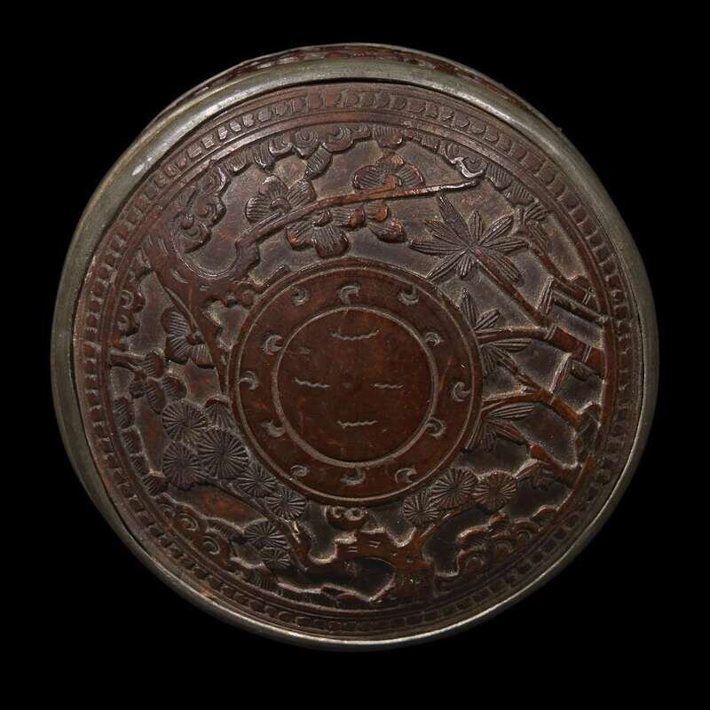 A Chinese pewter-mounted carved coconut circular box and cover late 18th/first half 19th century