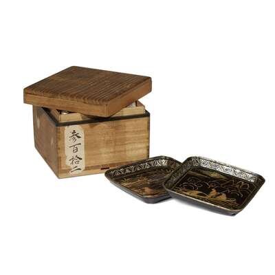 each with shallow flared sides and canted corners, inlaid with scenes depicting landscapes with figures, Japanese wood box.