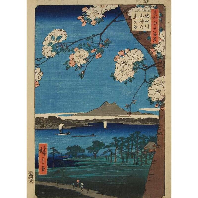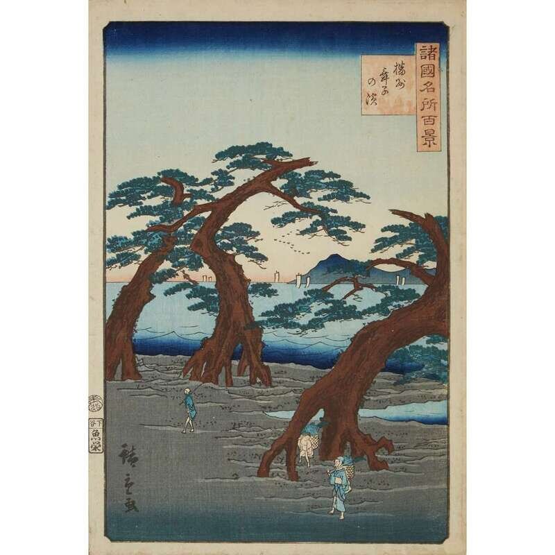Sumidagawa Suijin no mori Massaki, from the series Meisho Edo Hyakkei, 1856 L: 13 1/2 in., 34.3 cm; W: 8 3/4 in., 22.2 cm Beach at Maiko in the province of Harima, from the series of One Hundred Views of Famous Places in the Province, 1859 L: 13 in., 33 cm; W: 8 1/2 in., 21.5 cm