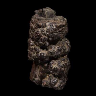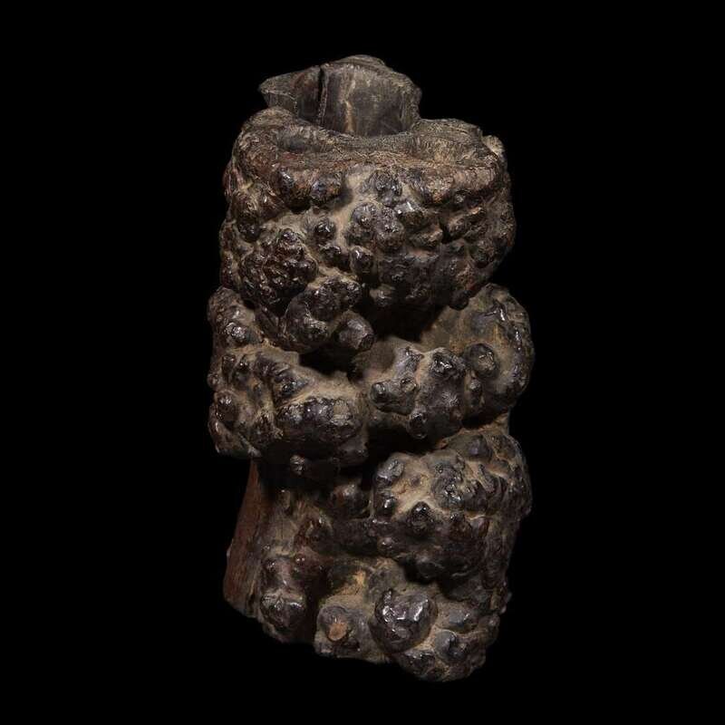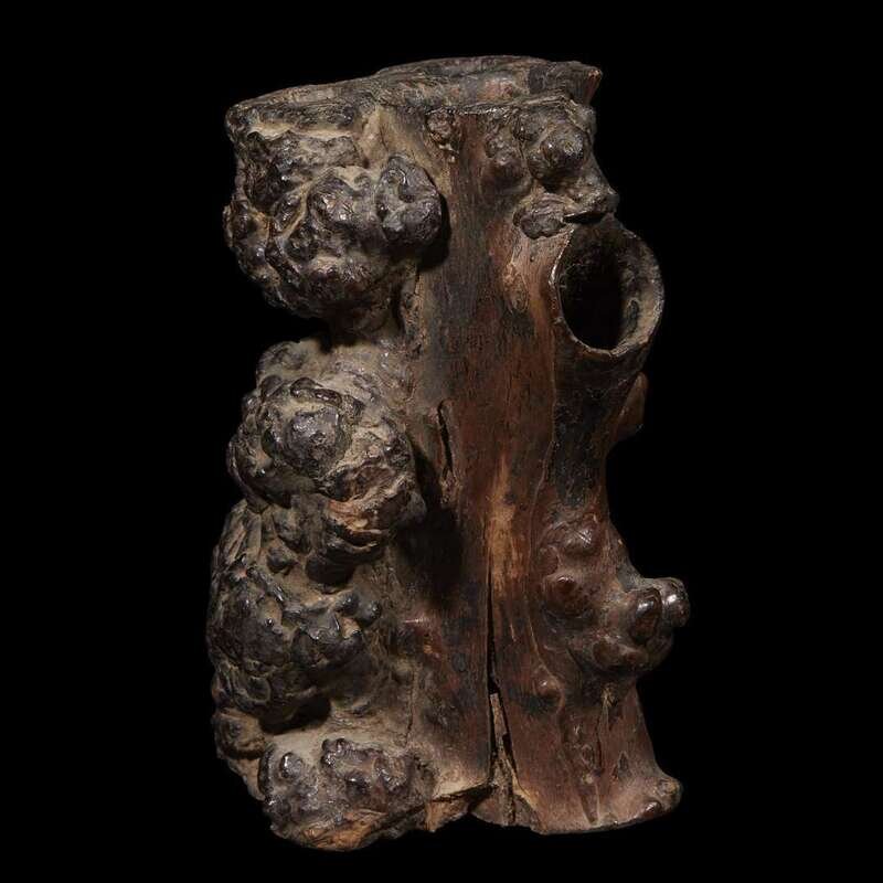 the vessel formed from an irregular section of burlwood pierced with several apertures of varying size and shape.