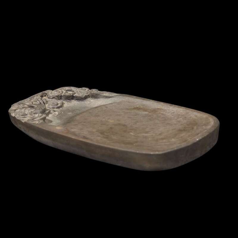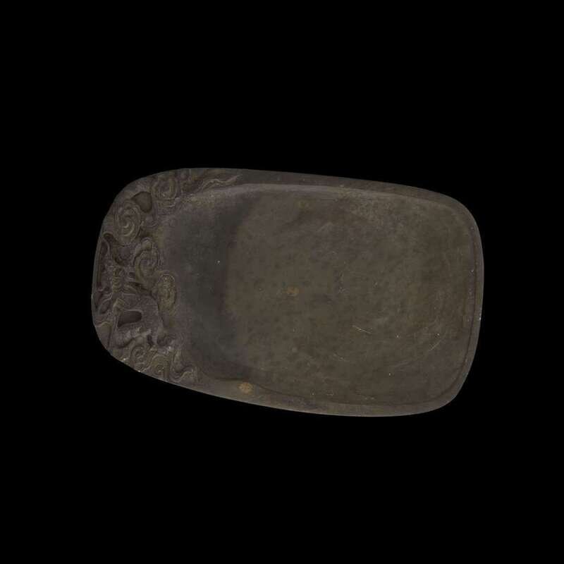 of tapered rectangular outline with rounded corners, the smooth palette emptying into a crescent-shaped ink-pool, the top carved with a dragon amid swirling clouds, several circular inclusions to body front and back.