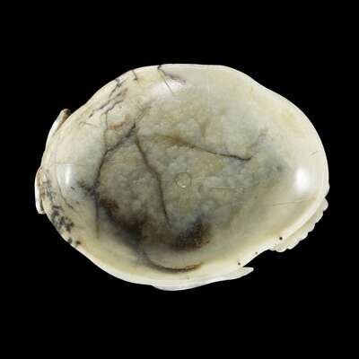 carved in the form of a lotus leaf, with stem issuing from the center of the base, the creamy white stone with grey and black veins.