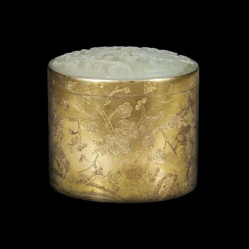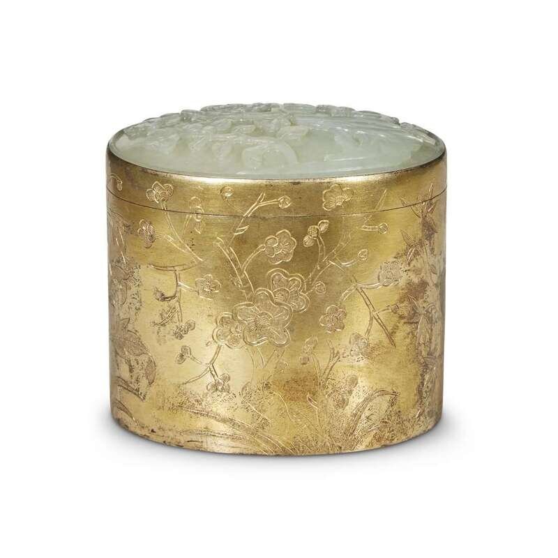 the jade carved with peony and rockwork, the oval box engraved with various plants and flowers including prunus, magnolia and bamboo.