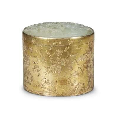 A Chinese celadon jade plaque mounted in a engraved gilt metal box jade plaque: 18th century