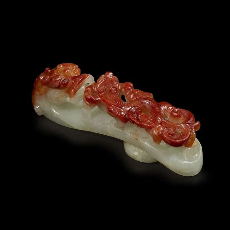 A Chinese russet and celadon jade 'qilong' belthook qing dynasty