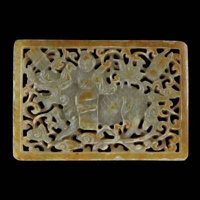 A Chinese celadon and russet jade pierced 'immortal on qilin' belt plaque 17th/18th century