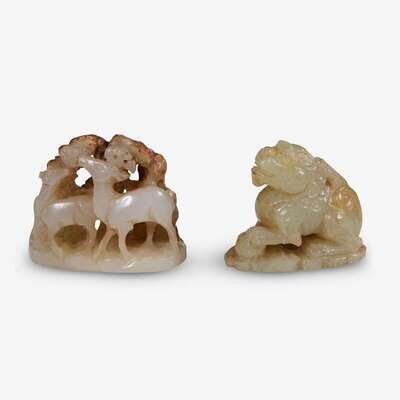 the first carved in openwork with two deer, the stone of a white and russet color, the other carved with a recumbent qilin, the stone of a yellow tone.
