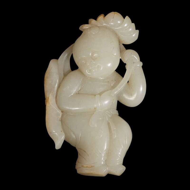 the standing boy holding a long stalk issuing a lotus bloom and leaf, the figure dressed in loose robes and trousers, the stone of a celadon tone and accentuated with russet skin.