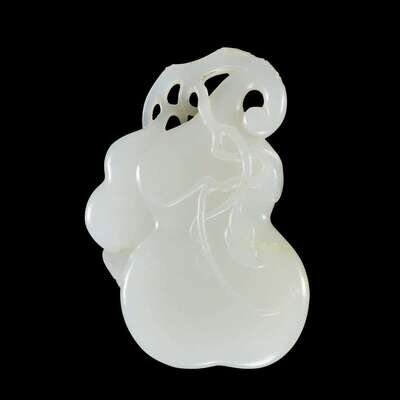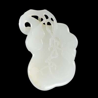 worked in low relief with one large and two small gourds borne on branches issuing furled leaves and curling tendrils, reverse incised with four characters, the stone of an even colour with occasional natural inclusion.