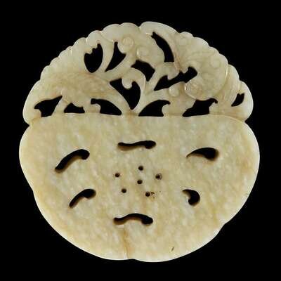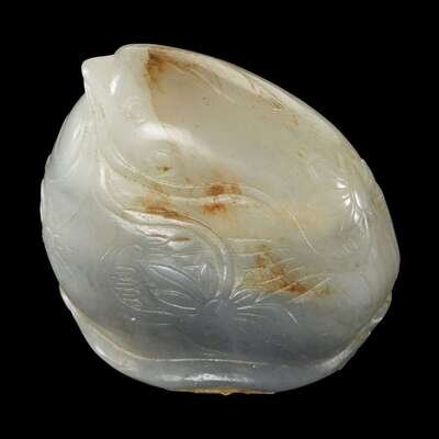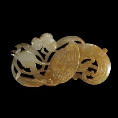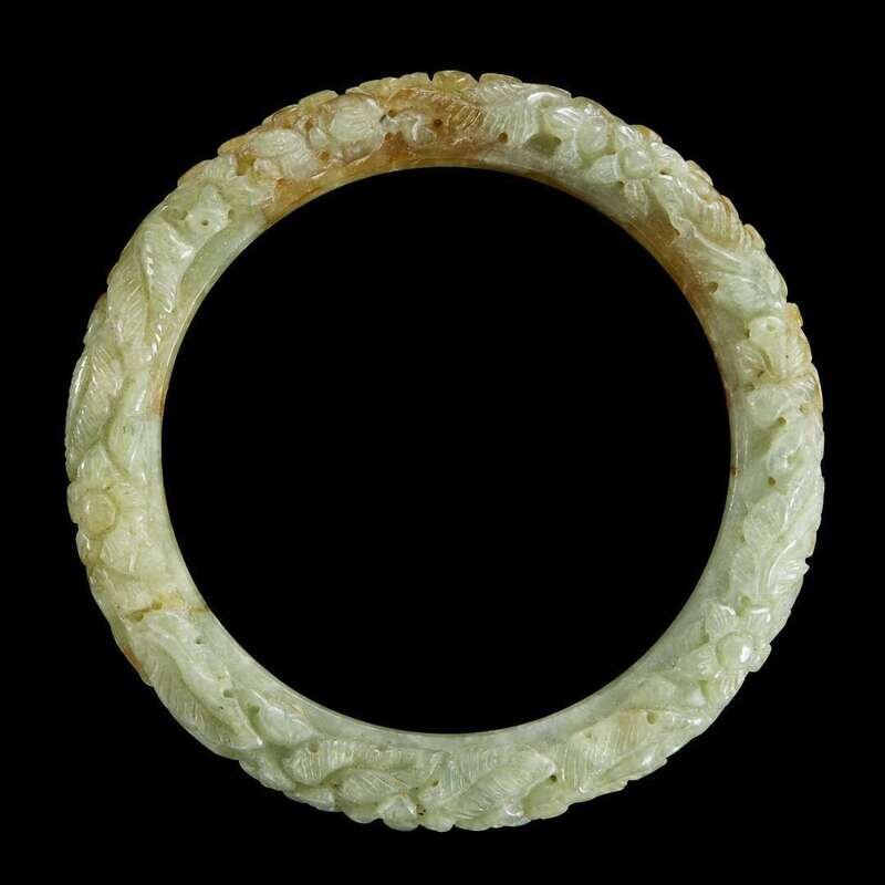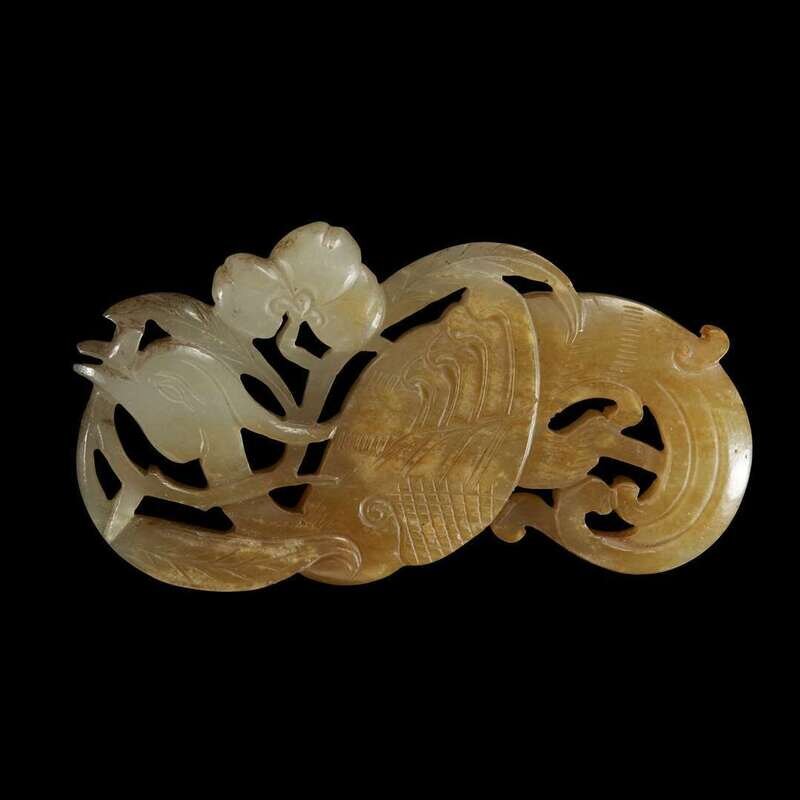 comprising a floral and foliate-carved pale green and russet jadeite bracelet, a gray and white jade pebble carved in the form of a quail with lotus blossoms; a pierced mottled grey-white jade 'lotus pod slice, lingzhi and bat' circular plaque; and grey-white and russet jade pendant of phoenix with blossom.