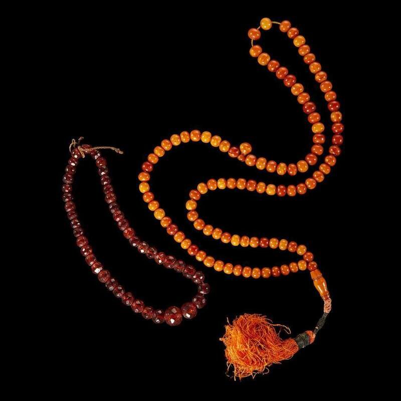 comprising a opaque orange-brown amber partial court necklace, with orange silk and copper wire tassel; a strand of forty-four grduated reddish brown transparent faceted amber beads, and two parcial strands of amber prayer beads, disassembled.