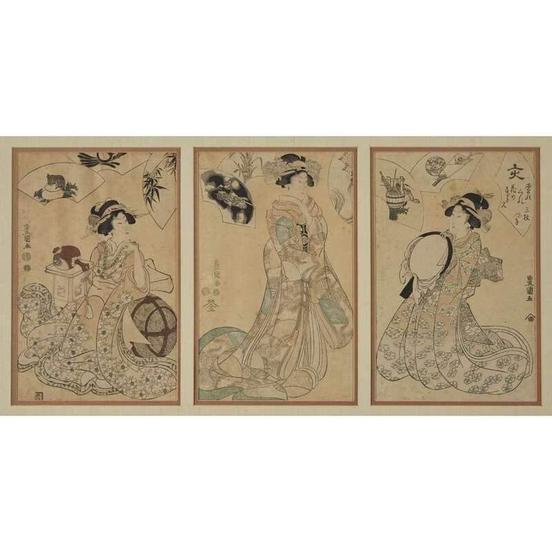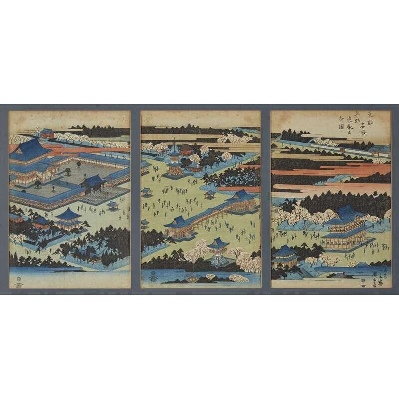 ANDO HIROSHIGE (1797-1858), UTAGAWA KUNIYOSHI (1797-1861), TOYOKUNI I (1769-1825) THREE FRAMED WOODBLOCK TRIPTYCHS