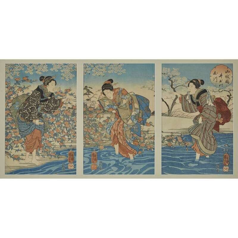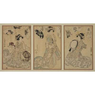 Ueno Toezan zenzu Yamashiro no kuni Ide no Tamagawa Three bijen from the series Sanmai Tsuzuki, circa 1811 each sight H approximately: 13 1/2 in., 34 cm; W: 9 in., 23 cm