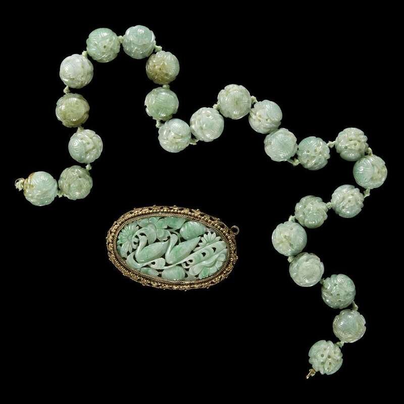 A Chinese jadeite necklace and a carved 'ducks' jadeite and gilt metal pendant