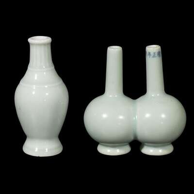 the oval body resting on a splayed foot and rising to a lipped rim, covered with a translucent light celadon glaze together with a small Chinese celadon-glazed double bottle vase, with Yongzheng six-character mark to neck.