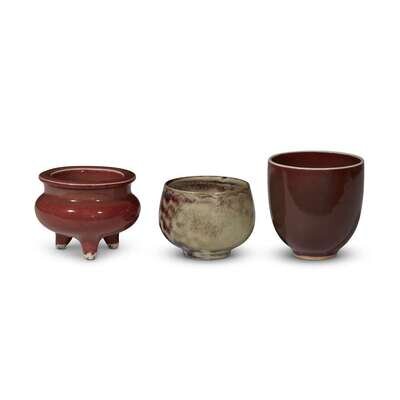comprising a small peachbloom-glazed tripod censer, a flambé-glazed mushroomy burgundy U-shaped cup, and a 'Sang de Boeuf' glazed cup, with underglaze-blue double-ring mark to base.