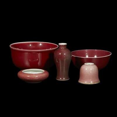 comprising a bell-shaped water coupe, Taibaizun, underside with double-ring in underglaze blue; a baluster vase; a puce-enameled bowl; a copper red bowl; and an open circular brush washer with Kangxi six-character mark.