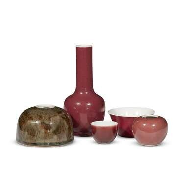 comprising a small copper red-glazed U-shaped wine cup; a puce-enameled flared circular bowl; a copper red and brown-glazed beehive water coupe, Taibaizun; a puce-glazed bottle vase, underside with four-character mark; and a copper red-glazed spherical water coupe, with Xuande four-character mark.
