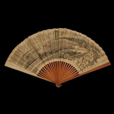 A rare Japanese commemorative fan, depicting the first steam train line in Japan circa 1872