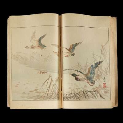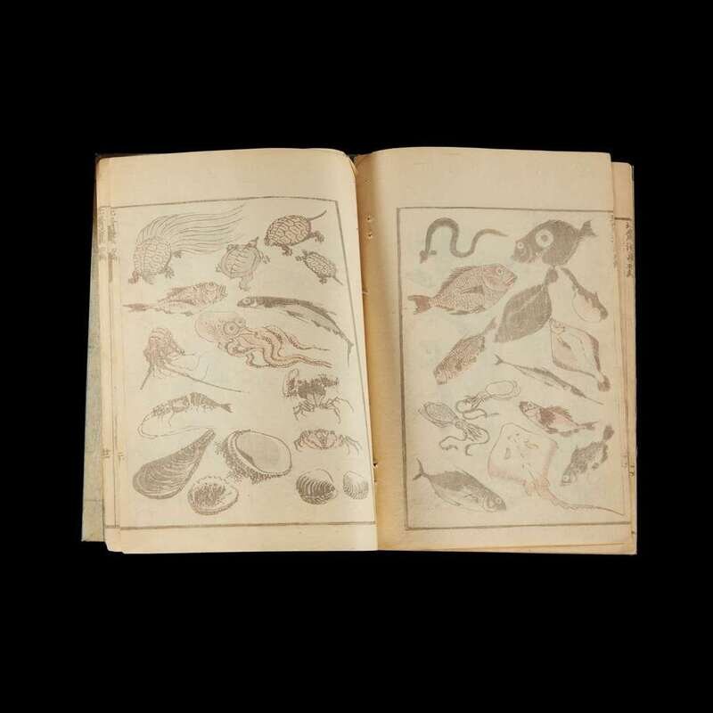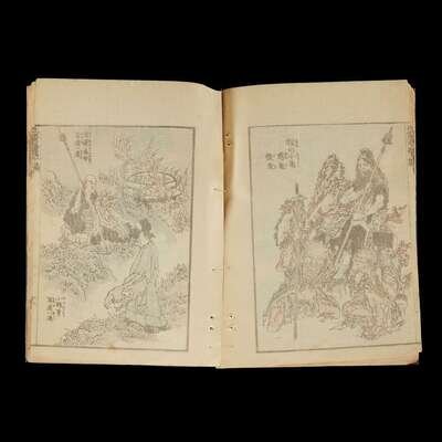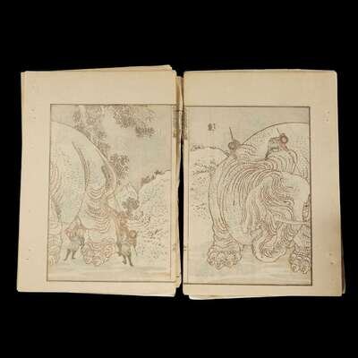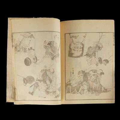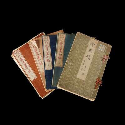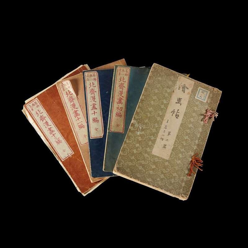 including volume one, ten, eleven and thirteen from the set of fifteen of the Hokusai Manga; together with the second edition of the Book of Drawings, Gumma Prefecture, Women's High School, Okura Book Co., Meiji era, 25th year (1883).