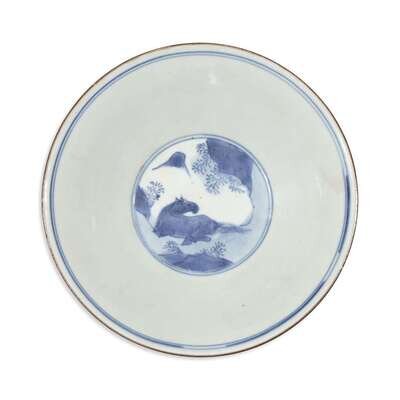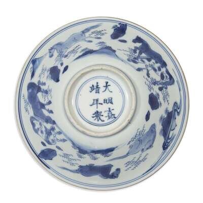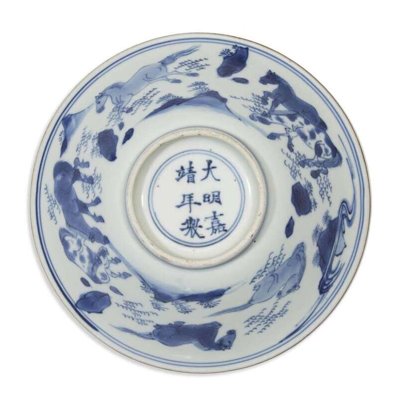 A Chinese blue and white 'horses' conical bowl jiajing six-character mark, shunzhi/kangxi period, 17th century