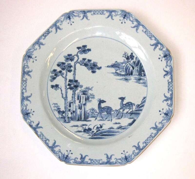 the center painted with a landscape with two deer by a river, the rim decorated with floral designs.