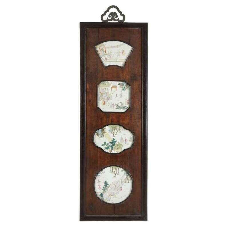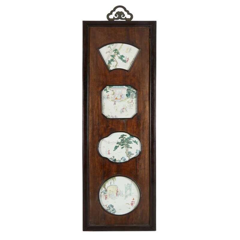 each panel inset with four shaped porcelain plaques decorated in famille rose enamels depicting courtly figures in palace gardens. Note: the scenes depicted on these plaques appear to be based on a Ming dynasty scroll in The Palace Museum, Beijing, entitled 'Amuseuments in the Xuande Emperor's Palace'.
