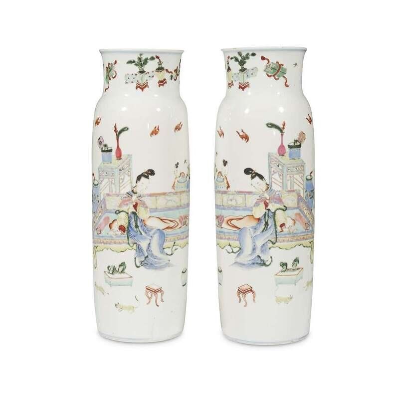 A pair of Chinese famille rose 'figural' rouleau vases artemisia leaf mark