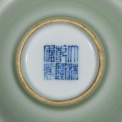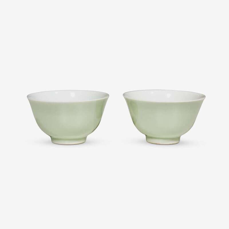 A pair of Chinese celadon-glazed porcelain wine cups qianlong six character seal mark and possibly of the period