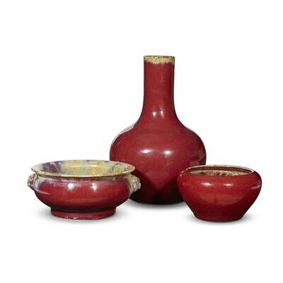 comprising a flambe-glazed bombe censer, flanked with a pair of mask handles; a copper red glazed alms bowl form brush washer; and a Langyao-type red glazed bottle vase.