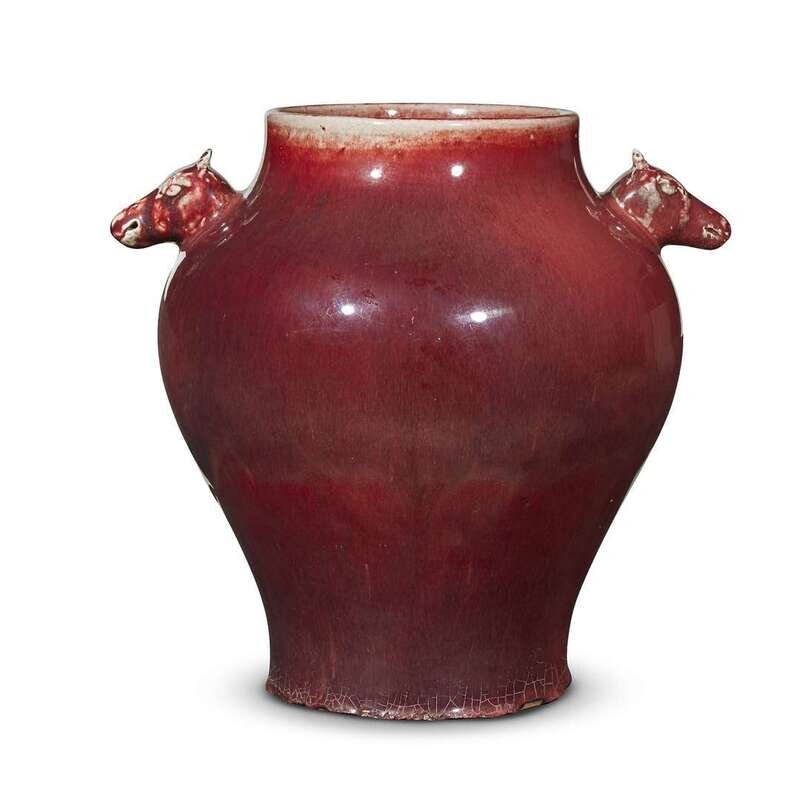 of baluster form, applied with a pair of deer head handles to the shoulder, the exterior covered in a rich copper-red glaze pooling slightly at the foot and draining to white at the rim, suffused with a network of fine crackle throughout.