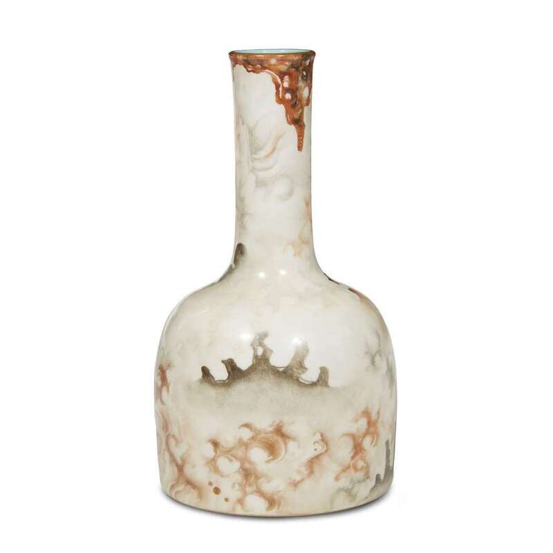 the bell-shaped body surmounted by a slender tubular neck with lipped rim, decorated with copper red and black and grey veining, the base and interior turquoise glazed.