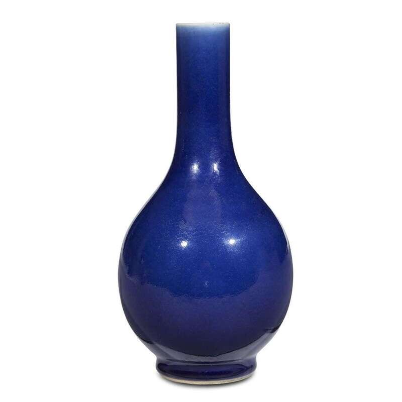 with a pear-shaped body gently rising to a tall cylindrical neck, the exterior applied with a deep blue glaze thinning around the mouth.