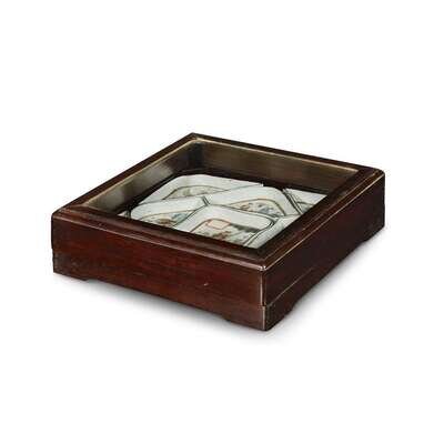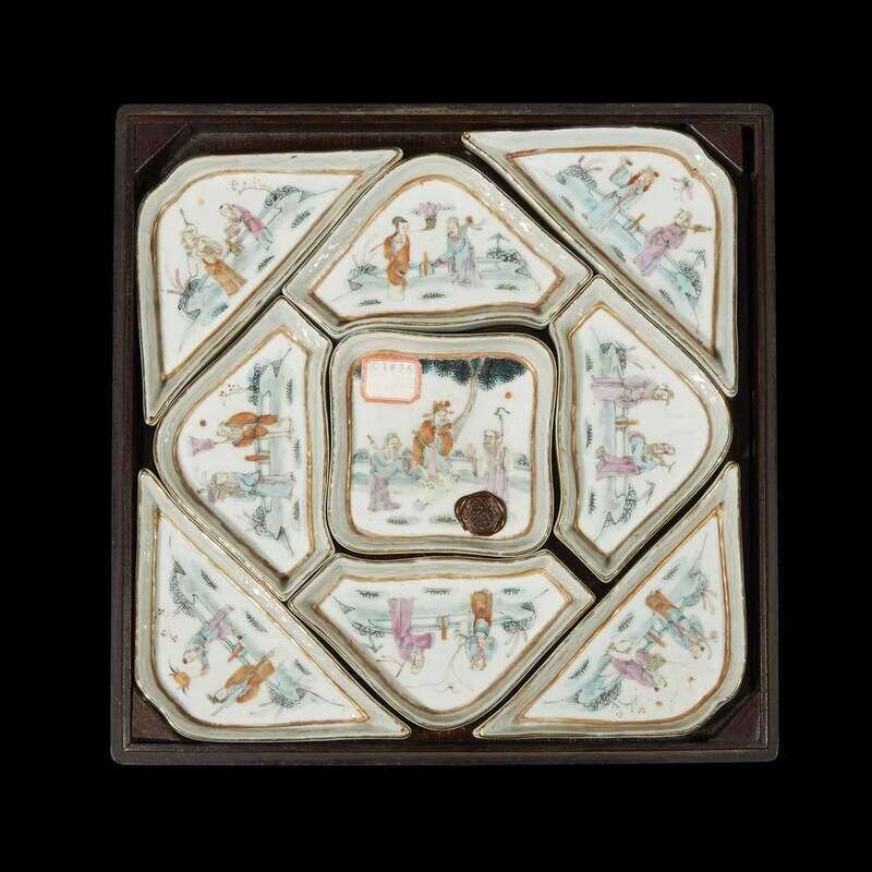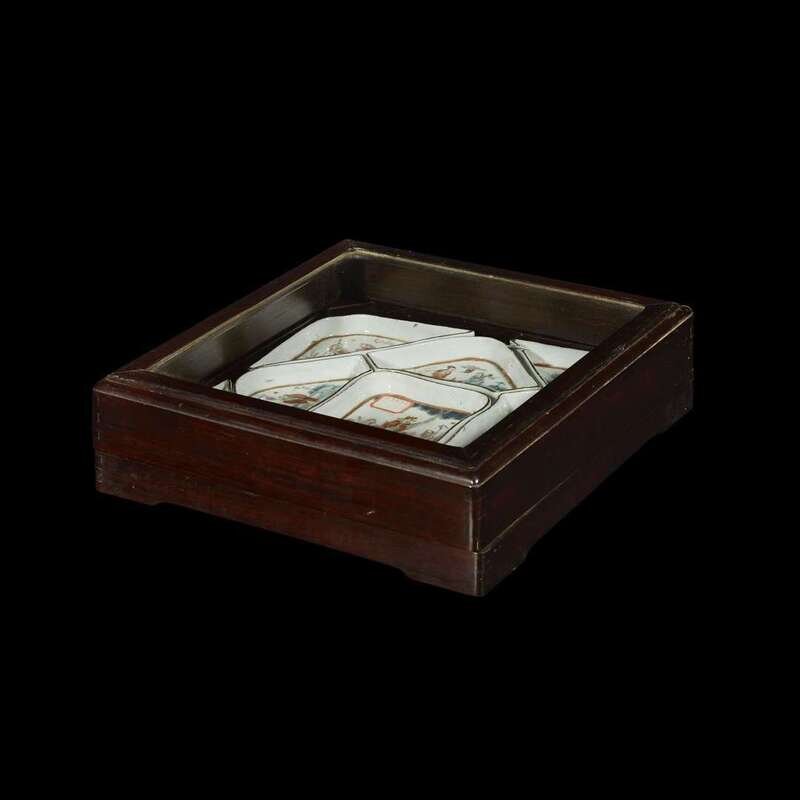 each tray painted with figures in landscape, bordered by thin gold lines, the central square tray inscribed with two characters to base. together with a hardwood case and cover .