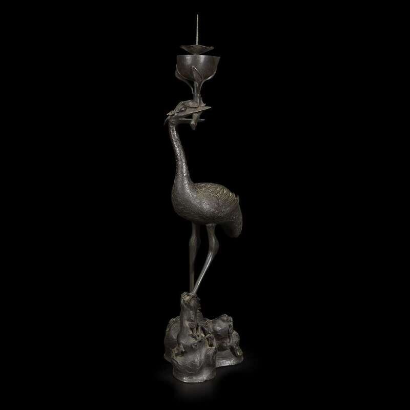 A Japanese patinated bronze crane-form candlestick edo period, 18th/19th century
