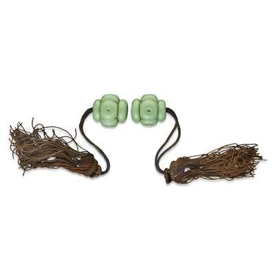 each four-lobed weight with applied circular ends, accompanied by a pair of dark brown silk tassels.