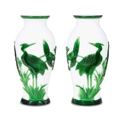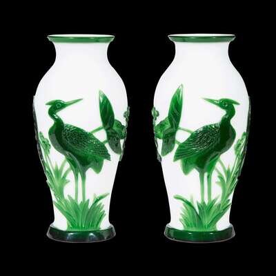 of opaque milky white glass overlaid with a layer of translucent green glass, carved with crane, lotus leaf and prunus.