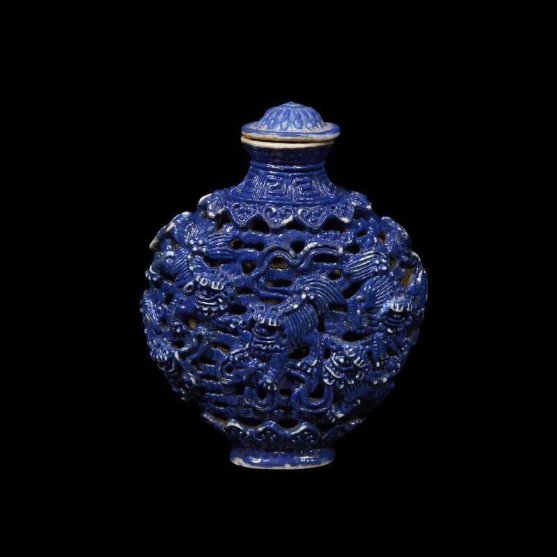A Chinese blue glazed molded porcelain 'lions' snuff bottle